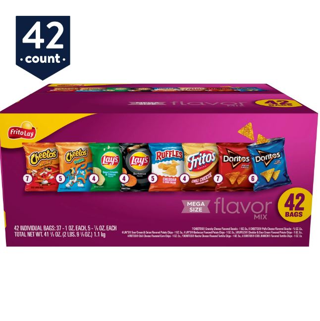 • 42 Count Flavor Mix Box Includes: 7 – Cheetos Crunchy Cheese Snacks, 5 – Cheetos Puffs Cheese Snacks, 4 – Lay’s Sour Cream & Onion Potato Chips, 4 – Lay’s Barbecue Potato Chips, 5 – Ruffles Cheddar & Sour Cream Potato Chips, 4 – Fritos Chili Corn Chips, 7 – Doritos Nacho Cheese, and 6 – Doritos Cool Ranch.