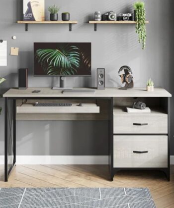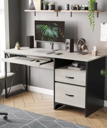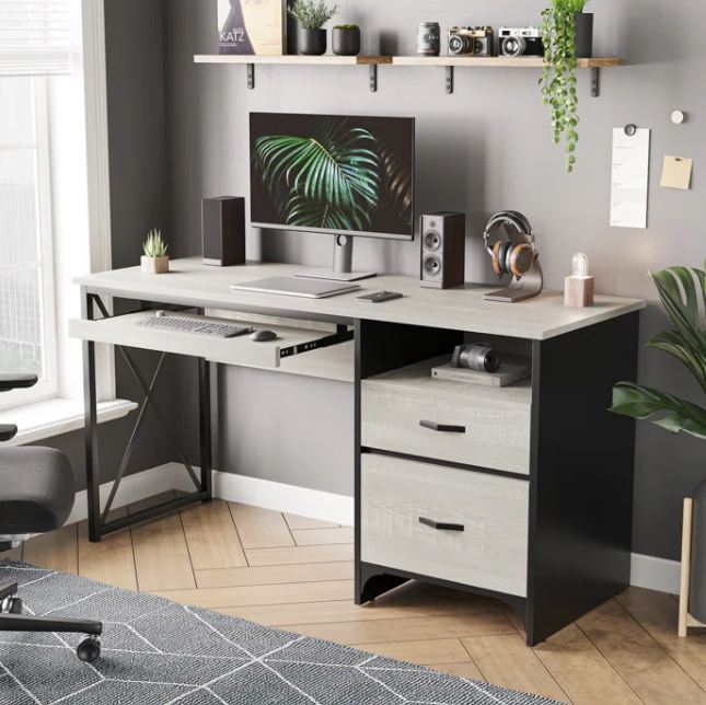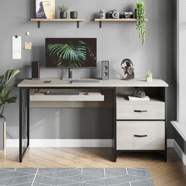 This desk pairs function and fashion with its spacious surface and mixed-material look. It has a frame that’s crafted from metal and engineered wood with a weathered, two-toned finish for plenty of rustic style and modern flair in your home office or living room. Two side drawers and a cubby shelf are ideal spots to tuck away files, binders, and other office accessories. There’s also a keyboard tray to make your WFH experience hassle-free. The desktop measures just over 55″ wide, giving you ample room for your computer, a reading lamp, and much more.