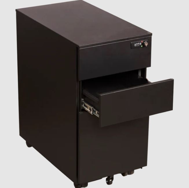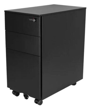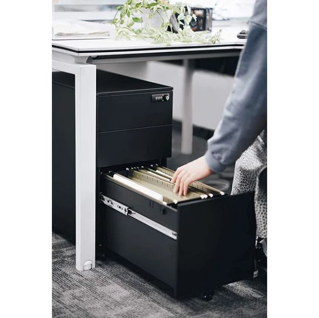 - We Work Office pedestal by Inbox Zero is built with a slim steel frame, that has two boxes and 1 file drawer. Featuring a combination lock for top-notch security, and 4 universal wheels to be able to take it with you wherever you please. It accommodates a foolscap size file vertically, and A4/ Letter size file laterally. Equipped with 1 hanging bar and key